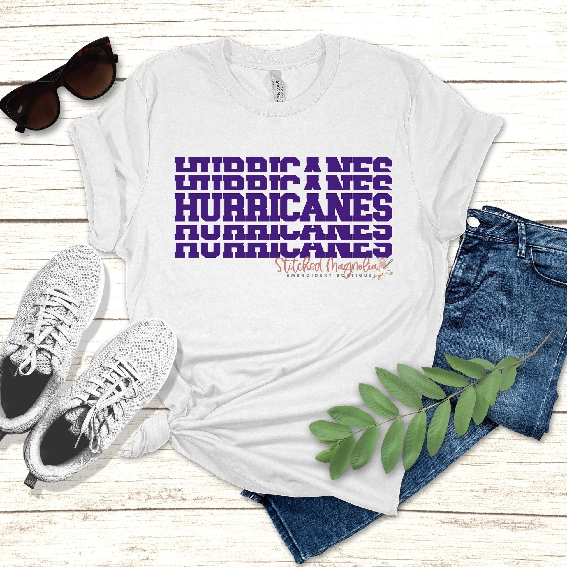 Show your Hurricanes pride with this bold and spirited t-shirt featuring a striking purple repeat text design. The word "HURRICANES" is displayed in multiple rows with a dynamic, eye-catching pattern that fades and repeats, creating a modern and energetic look perfect for game days and team events.