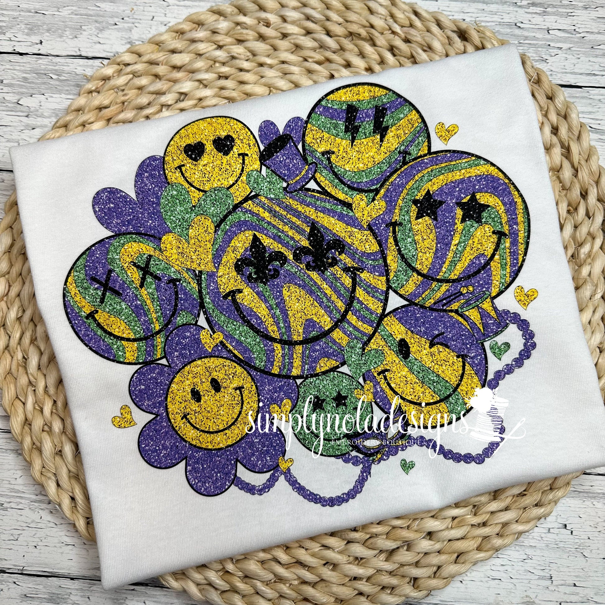 Woman’s Mardi Gras Shirt, Retro Mardi Gras Smiley Face Shirt, Retro Smiley Face, Mardi Gras Shirt, Retro Mardi Gras Shirt, Faux Glitter DTF
