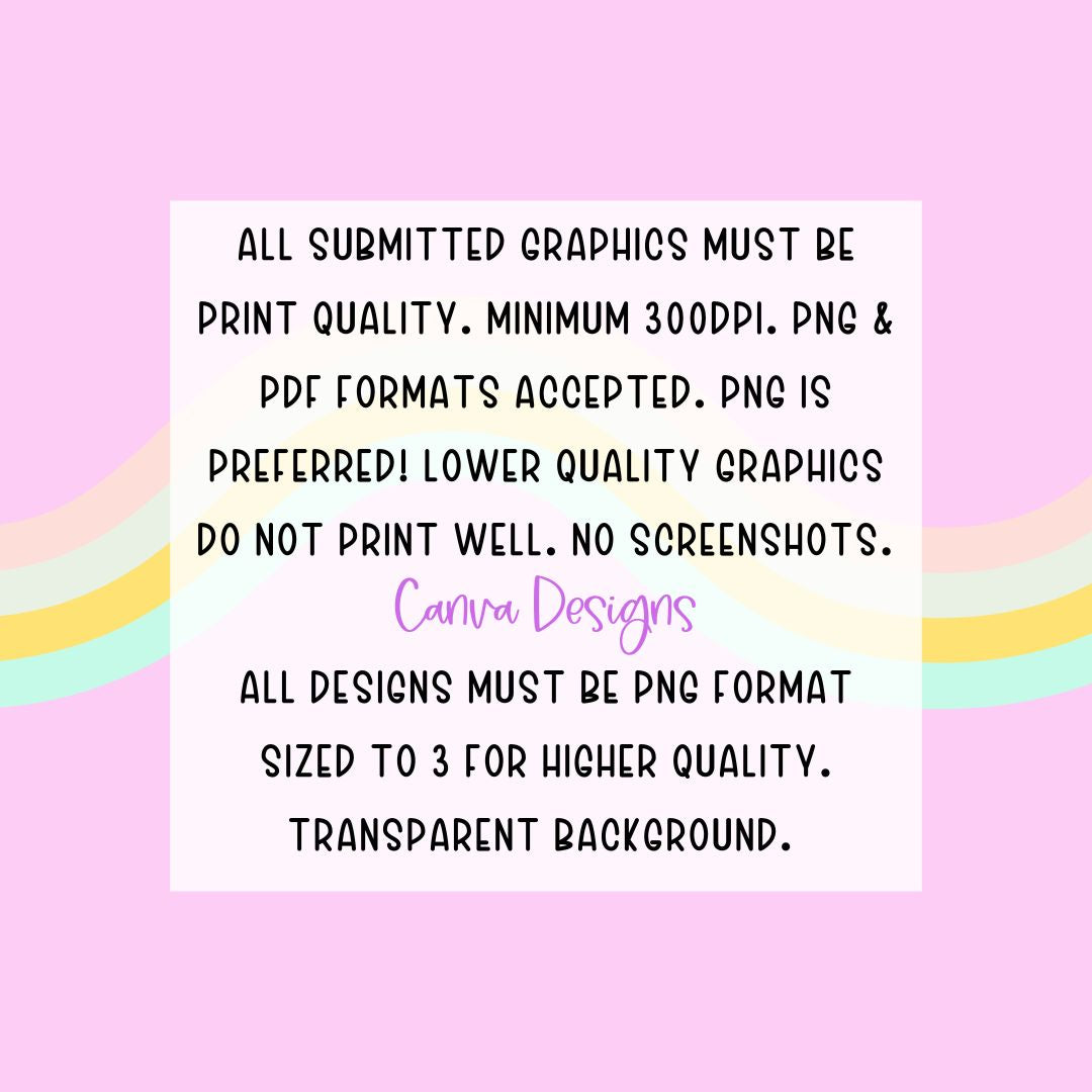 All submitted graphics must be print quality. Minimum 300dpi. PNG format! Lower quality graphics do not print well. NO screenshots.